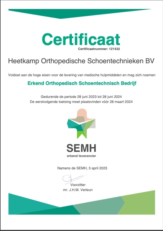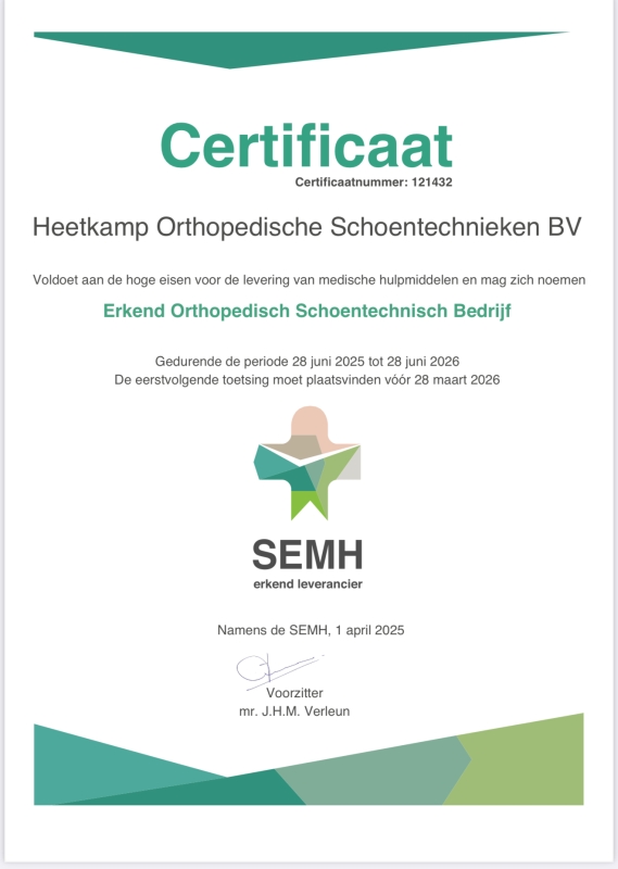 In maart 2025 zijn we getoetst en Heetkamp Orthopedische Schoentechnieken mag zich voor het komend jaar weer erkend SEMH-leverancier noemen.